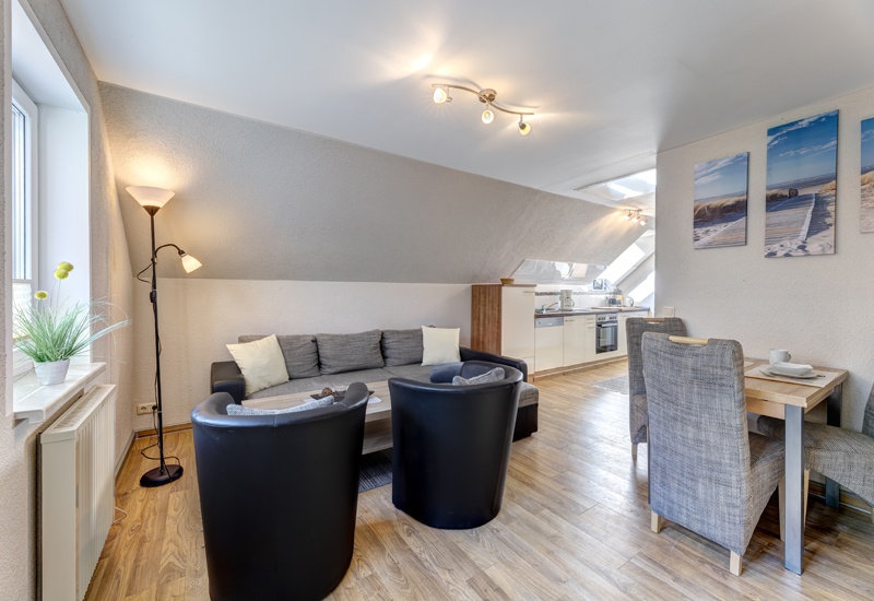 Diese 56m² große Ferienwohnung bietet 1-3 Personen einen angenehmen Wohn- komfort und ausreichend Platz. Vor dem Wohnraum befindet sich eine Terrasse, die in den Sommermonaten möbliert ist und zum Entspannen einlädt. Bei der Ausstattung der FeWo wurde viel Wert auf Qualität und Gemütlichkeit gelegt.
