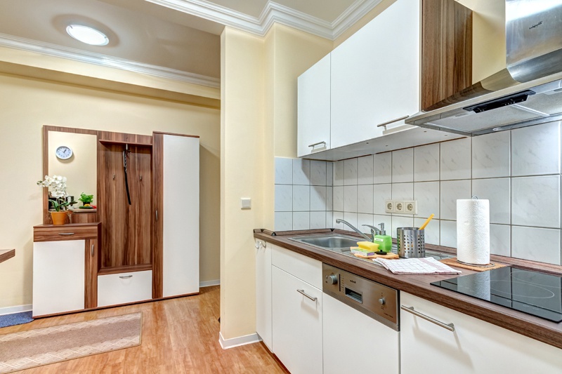 Küchenzeile mit 2-Plattencerankochfeld, Kühlschrank mit Gefrierfach, Geschirrspüler, Mikrowelle, Toaster, Kaffeemaschine, Wasserkocher und Küchengeschirr |